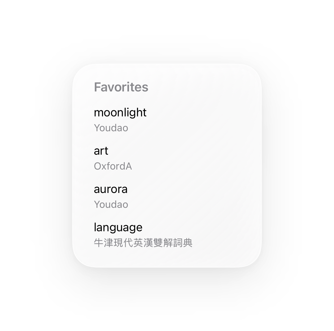 History and favorites remember the word with its dictionary, so returning to a saved lookup means returning to the source you trusted.
